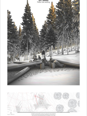 Having the trees become part of the interventions once they were cut down was key for reinforcing the narrative of the space. This runs parallel to the idea of not bringing in urban materials to the forest. The pine and spruce trees that dominate the clearing, should not lose their presence once cut down. Their use, and narrative propagate through the interventions in the forest. During their lifespan, the trees will grow, reproduce, get cut down, and slowly deteriorate. They bring a constant narrative of change, a change that especially strengthens the idea of informality within the gathering.